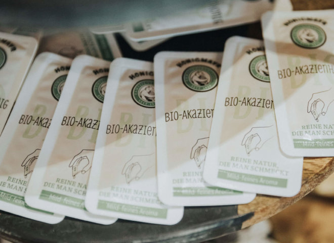 Der Korb ist gefüllt mit regionalen, hausgemachten und/oder Bioprodukten: