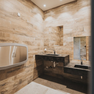 Besides, there are private bathrooms, washing cabins as well as a modern utility room equipped with washing machines and dryers – and a playground for the little ones.